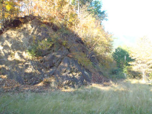 「幕岩」の面は、コンクリートの法面 のように平らで、自然の岩には見えない。 湯河原の幕岩でよく見かける、石切場の 跡地に似ている。 |