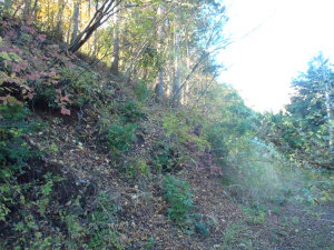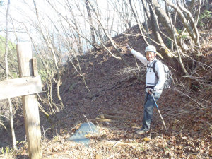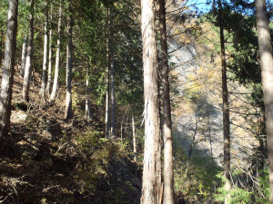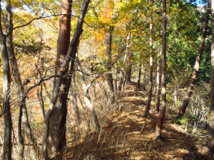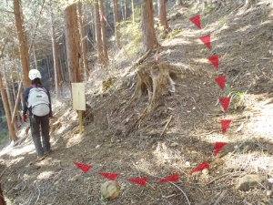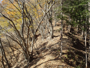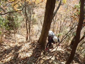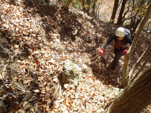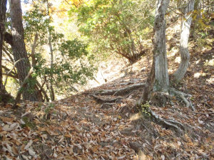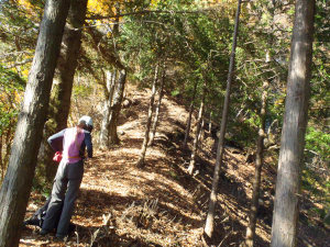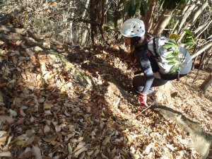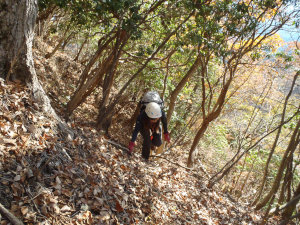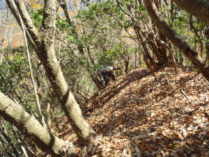 そして再び急な坂になる。 先ほどの大岩を巻いたとき ほどではないが、こちらも なかなか危険なところだ。 |
