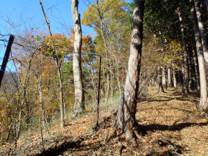 やがて南側の森が開けて、 明るい尾根になる。 シカ柵があり、南側(左側)に入れない。 |