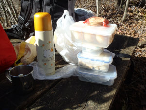 ここで少し早い昼食。 アンヌ隊員、タッパー出す出す。 |
