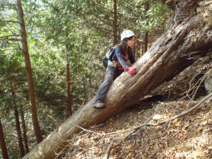 大きな倒木を越える。 この道は、倒木が多い。 |