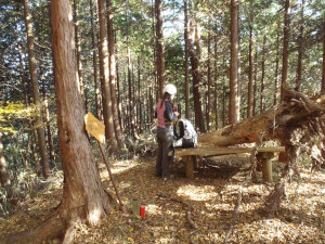 柏原ノ頭、登山道にある ベンチに到着。(11:10) (写真後ろの尾根から来た) よし、まずはここまで達成だ!