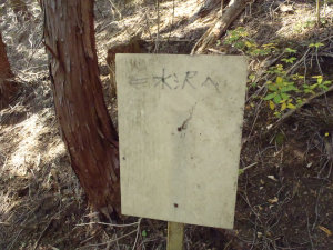 山の名前を示す板が針金で木に くくり付けられ、 針金が木に絡みついている。 |