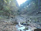 やがて沢床に到着する。 水が流れた様子はない。 道は、涸れ沢を何度も渡る。 |