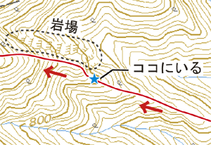 こうして、p745の山頂から下り、 元の登山道に戻ってくる。 |