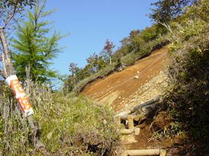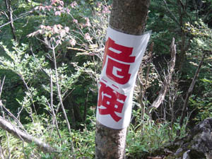 袖平山、頂上直下はガレ場になっている。 ここにも危険を示すマークがある。非常に危険なところだ。 緊張を強いられる、と思ったがこの先もちゃんと道があり、 まったく危なくない。 | |