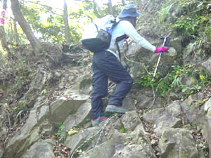 危険マークの意味はこれだ。岩場だ。 ロープが設置してある。 | |