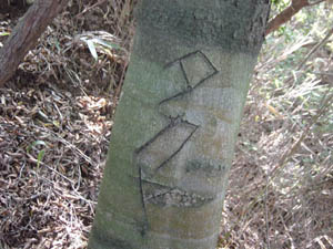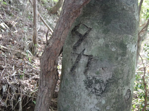 木に巻きつけてある危険マーク。 これは、北丹沢12時間山岳耐久レースの名残だろう。 | |