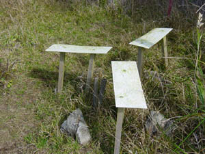 これは何だろうか。 ベンチにしては頼りないし、 物を置くには3つの向いている方向が理解できない。 何かの壊れた跡かな? | |
