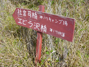 この道しるべの道は地図に載っていない。 等高線をよく見ると、尾根づたいに神の川キャンプ場方面に行ける。
