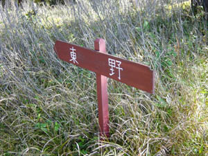 東野という道しるべがある。 青根の方に行く道らしい。 地図に載っているが廃道の扱いになっている。 むむ、探検隊の血が騒ぐ。行ってみたい。 | |
