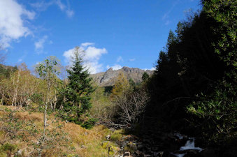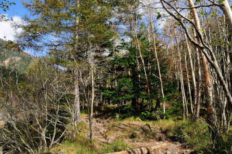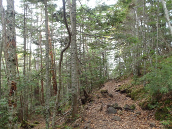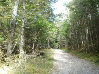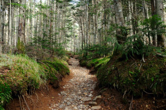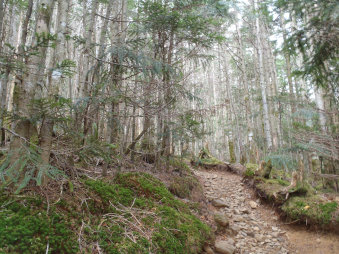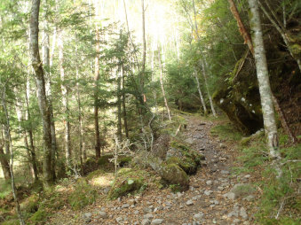 沢を離れると、 森の中を通り抜ける 幅の広い道になる。 |