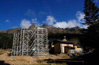 駐車場から2時間30分で 赤岳鉱泉に到着。 氷のクライミングウォール アイスキャンディーを建設中だ。 |
