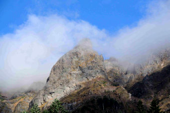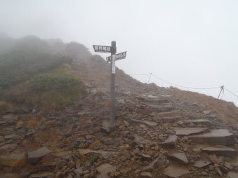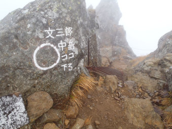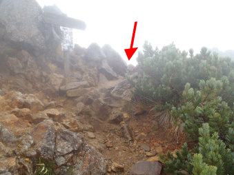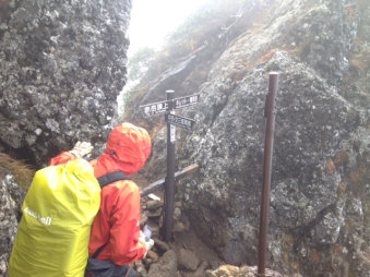 岩陰になっているところに やっとのことでたどり着く。 ここは、竜頭峰分岐だ。 ようやく写真を撮ることができる。