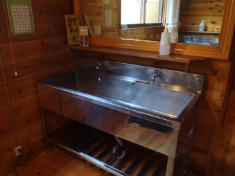 洗面所では、飲料水を補給できる。 石鹸は使えないが、消毒液が 備え付けてある。 |