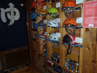 ヘルメットとアックスの貸し出し。 こちらは氷のクライミング、 アイスキャンディーで使う。