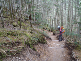 行者小屋への登山道を20分ほど進むと 階段になる。 |