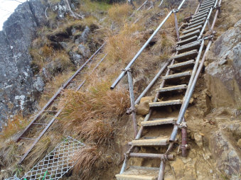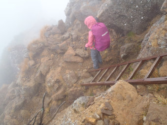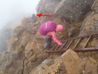 山頂の直下に梯子がある。 とても強い風が吹き上げてくる。 |