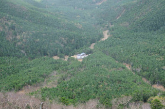 行者小屋が見える。 急な坂をこれだけたくさん登ってきた。 だから、気持ちとしては行者小屋が もっとちっちゃく、米粒くらいに 見えてほしい。 (実際にはレコード盤くらいに見える)