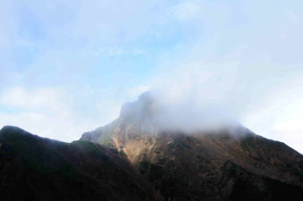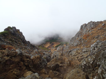 さらに20分ほど下ると ようやく、霧が晴れてくる。 山頂にかかっていた雲の下まで 下ってきたようだ。 風はまだ強いが、雨が止んでいる。 |