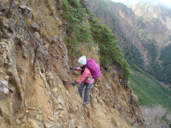 そして、クサリ場。 カニの、ななめバイだ。 ここは、クサリにつかまっていないと 足元が崩れたとき間違いなく滑落する。