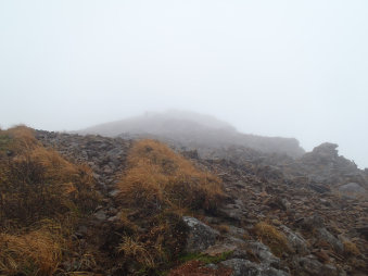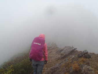 霧のために先がよく見えないが、 踏み跡はしっかりあるので、 道を外すことはない。 |