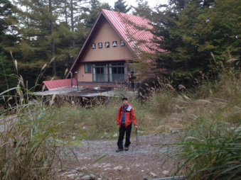 地蔵の頭から3分ほどで、 霧の中から赤岳展望荘が見えてくる。