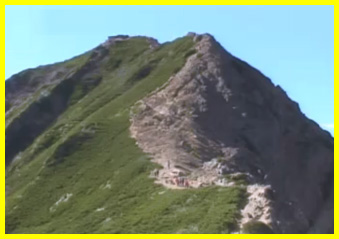 稜線の直下まで、クサリが設置されている。 これは登山道を踏み外さないように 道しるべの役目にもなっているようだ。 |